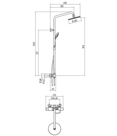 Miscelatore esterno doccia, completo di colonna doccia con soffione 250 x 250 mm interamente in ottone, anticalcare e doccetta monogetto