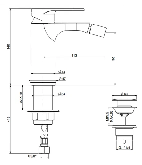 Miscelatore monocomando per bidet con scarico up & down; con flex inox cm 37 att. 3/8” F.