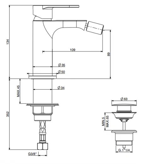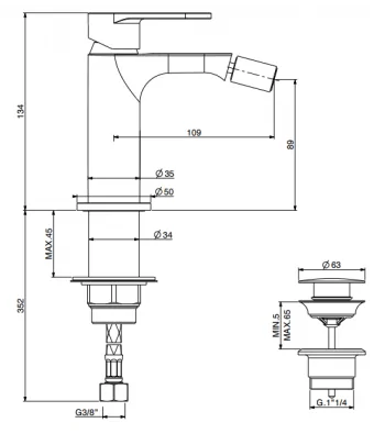 Miscelatore monocomando per bidet con scarico 1”1/4 con flex inox cm 50 att. 3/8” F.