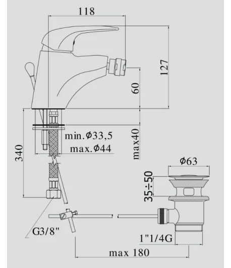 Miscelatore bidet con scarico automatico e flex inox di alimentazione