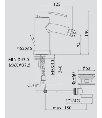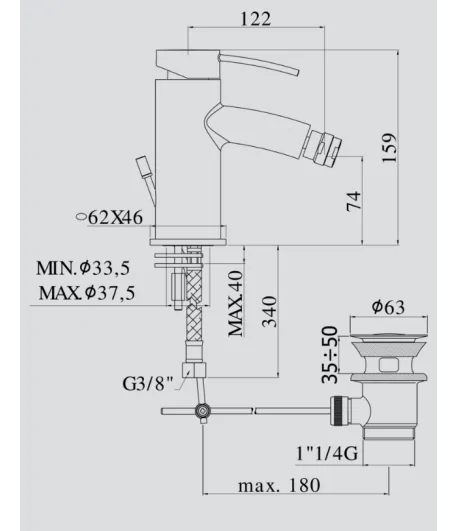 Miscelatore bidet con piletta regolabile con tappo a scatto, flex inox di alimentazione