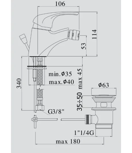 Miscelatore monocomando per bidet con scarico up & down; con flex inox cm 37 att. 3/8” F.