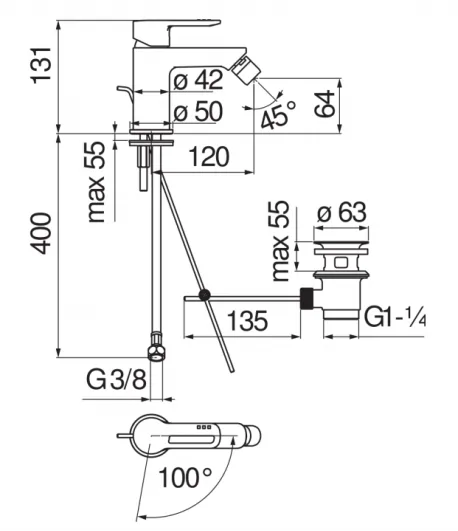 Miscelatore monocomando per bidet con scarico 1”1/4 con flex inox cm 50 att. 3/8” F.