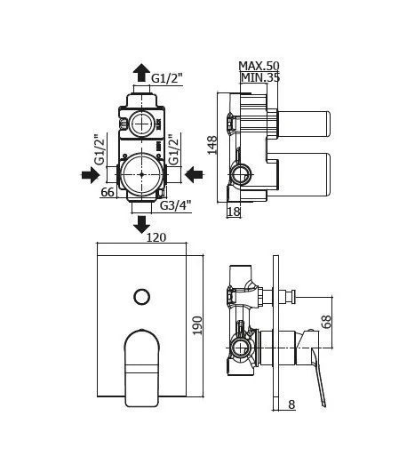 Miscelatore termostatico incasso doccia (3 uscite) con