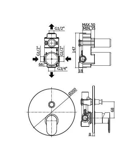 Miscelatore monocomando per doccia incasso, con deviatore 3 vie.