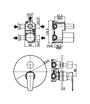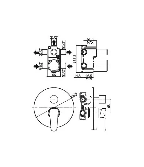 Miscelatore monocomando per doccia incasso, con deviatore 3 vie.