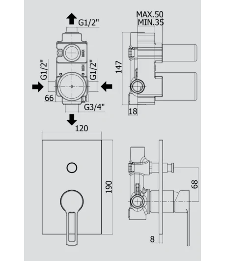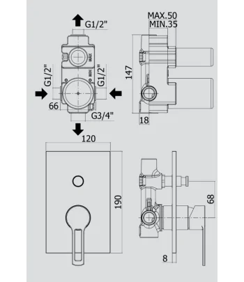 attacchi calda/fredda e superiore 1/2”G - attacco inferiore 3/4”G