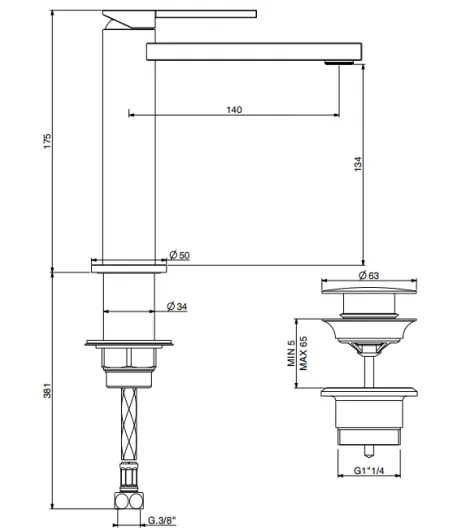 Miscelatore lavabo con piletta regolabile con tappo a scatto, flex inox di alimentazione, bocca 140 mm