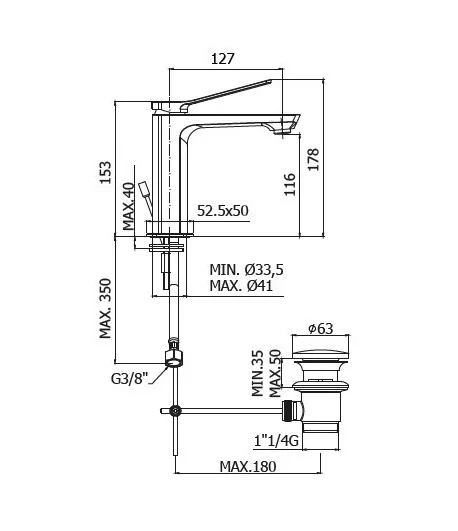 Miscelatore monocomando per lavabo con scarico 1”1/4 con flex inox cm 50 att. 3/8” F.