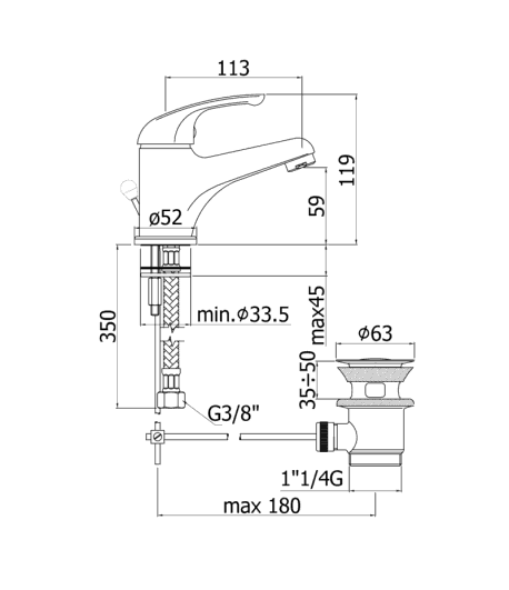 Miscelatore lavabo con scarico automatico e flex inox di alimentazione, bocca 110 mm