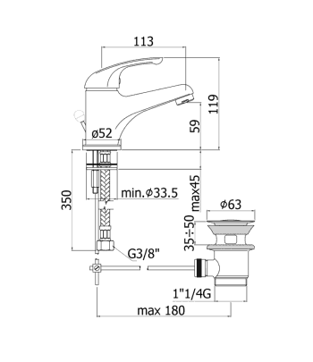Miscelatore lavabo con piletta regolabile con tappo a scatto, flex inox di alimentazione, bocca 135 mm