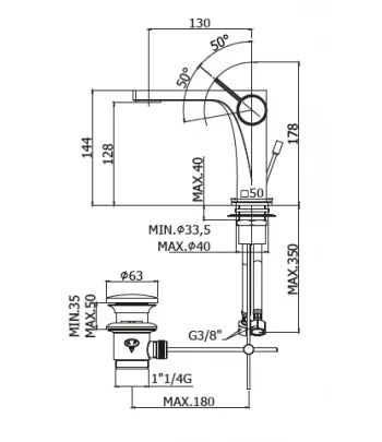 Miscelatore lavabo con piletta regolabile con tappo a scatto, flex inox di alimentazione, bocca 135 mm