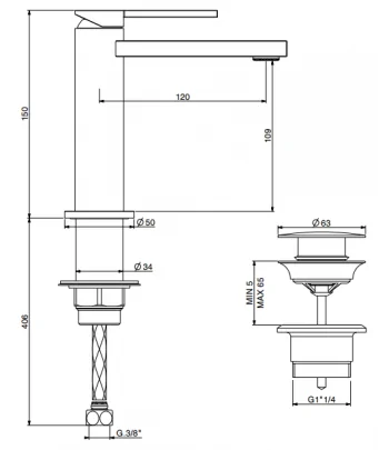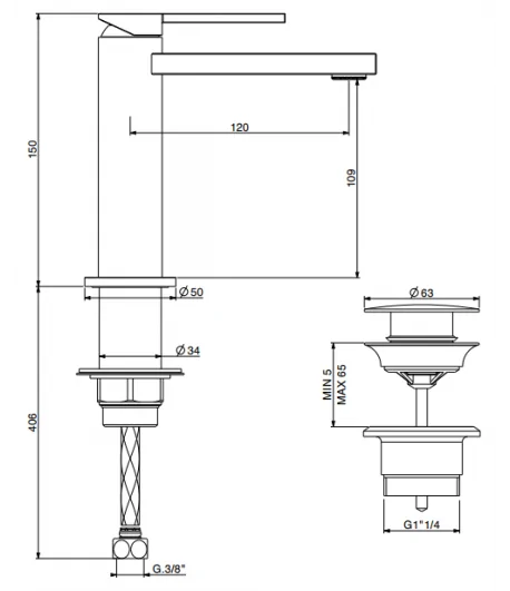 Miscelatore lavabo con piletta regolabile con tappo a scatto, flex inox di alimentazione, bocca 120 mm.