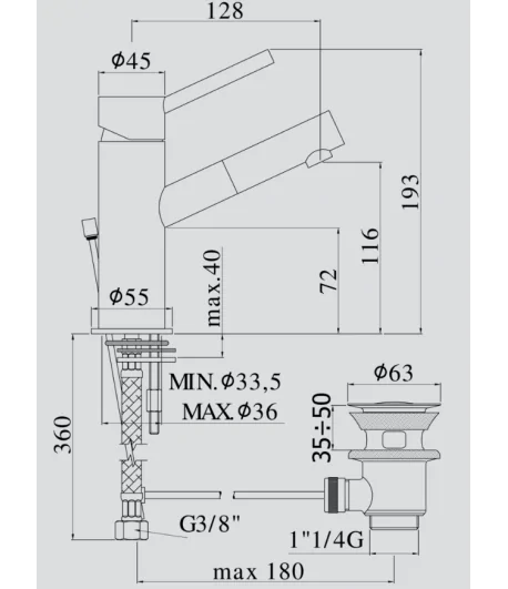 Miscelatore monocomando per lavabo con scarico 1”1/4; con flex