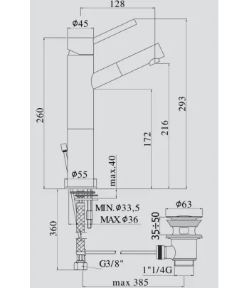 Miscelatore lavabo con piletta regolabile con tappo a scatto e flex inox di alimentazione