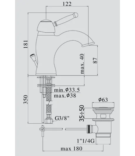 Miscelatore lavabo con piletta regolabile con tappo a scatto, flex inox di alimentazione, bocca 115 mm