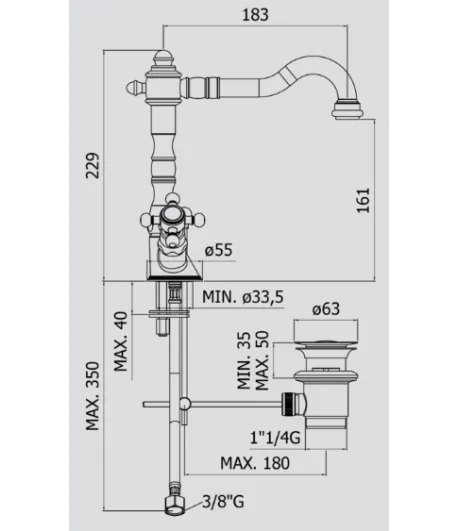 Miscelatore lavabo con piletta regolabile con tappo a scatto, flex inox di alimentazione, bocca 135 mm