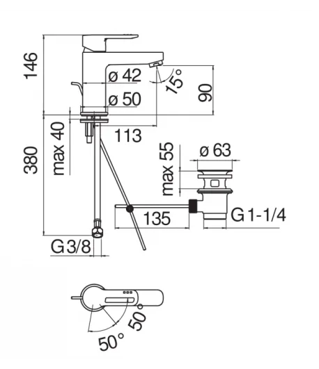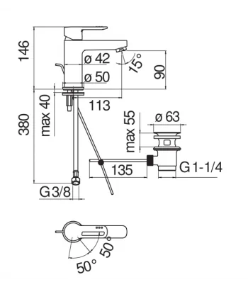 Miscelatore lavabo con piletta regolabile con tappo a scatto, flex inox di alimentazione, bocca 160 mm.