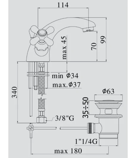 Miscelatore lavabo con scarico automatico e flex inox di alimentazione, bocca 110 mm