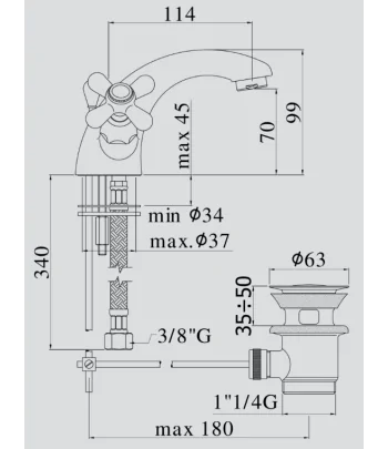 Miscelatore lavabo con piletta regolabile con tappo a scatto, flex inox di alimentazione, bocca 135 mm
