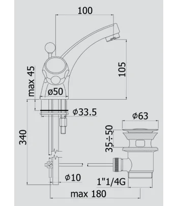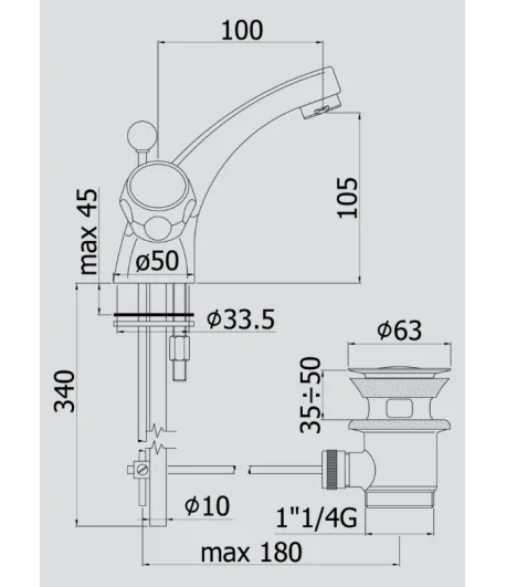 Miscelatore lavabo con piletta regolabile con tappo a scatto, flex inox di alimentazione, bocca 135 mm