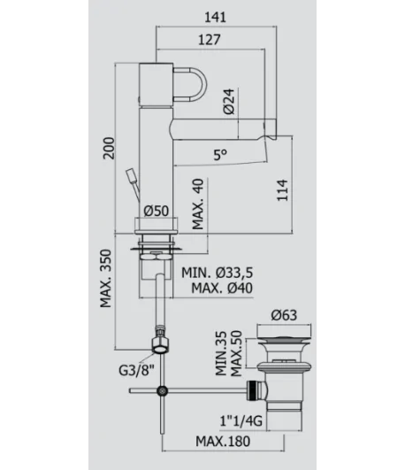 Miscelatore lavabo con piletta regolabile con tappo a scatto e flex inox di alimentazione