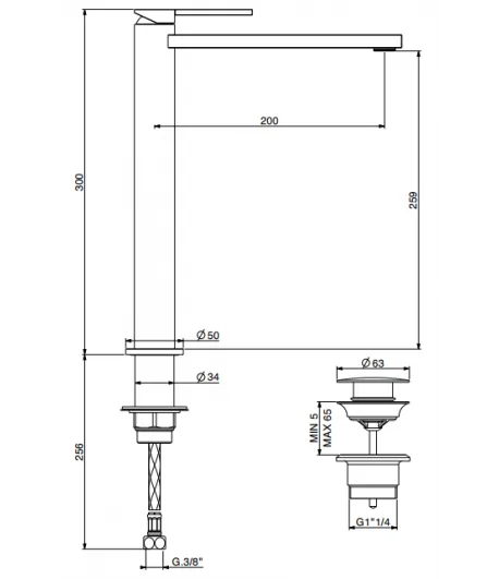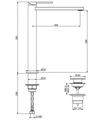 Miscelatore lavabo con piletta regolabile con tappo a scatto, flex inox di alimentazione, bocca 200 mm