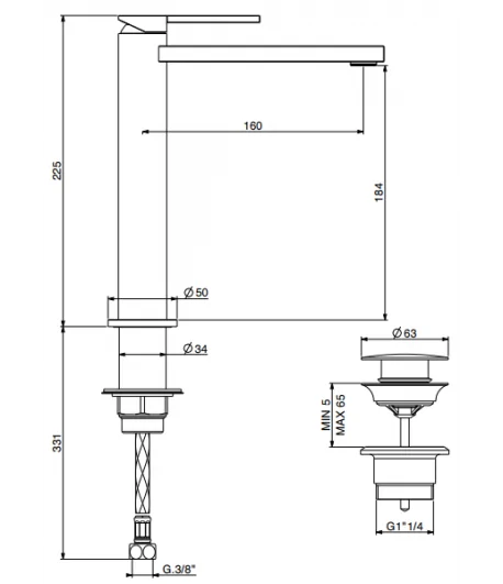 Miscelatore lavabo con piletta regolabile con tappo a scatto, flex inox di alimentazione, bocca 160 mm.