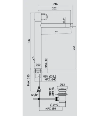 Rubinetto per lavandini da appoggio prolungato con