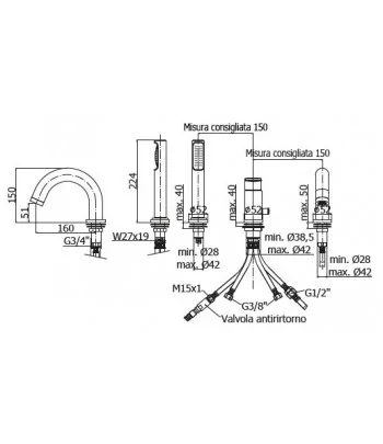Gruppo per bordo vasca 5 fori completo con flessibile in gomma da 200 cm e doccetta.