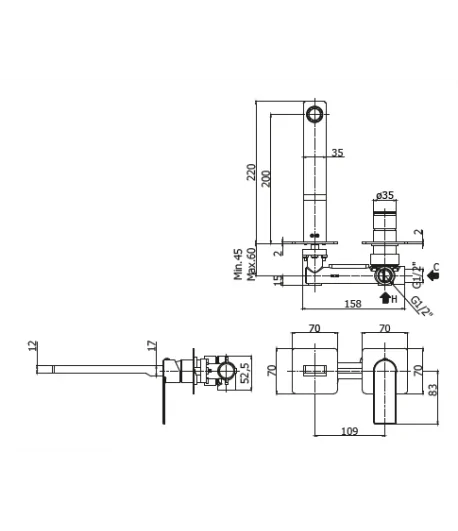 Batteria lavabo a muro con scatola ispezionabile bocca Ø 18 mm