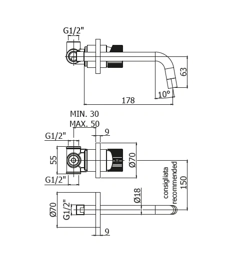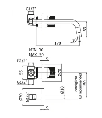 Miscelatore a muro per lavabo con