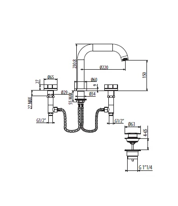 Rubinetto 3 fori per lavabo bagno con canna orientabile con