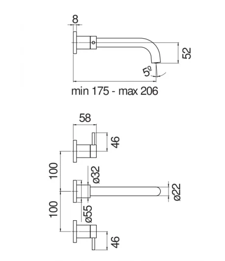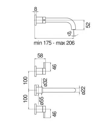 PARTE ESTERNA BATTERIA 3 FORI A PARETE CON BOCCA LUNGA PER LAVABO