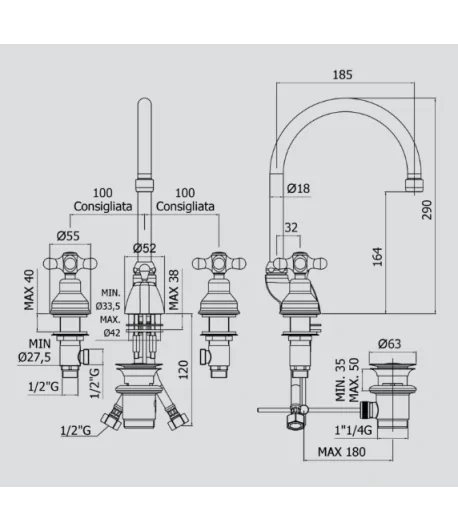 PARTE ESTERNA BATTERIA 3 FORI A PARETE CON BOCCA LUNGA PER LAVABO