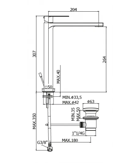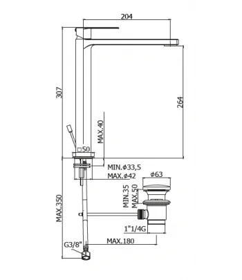 Miscelatore lavabo con piletta regolabile con tappo a scatto, flex inox di alimentazione, bocca 160 mm