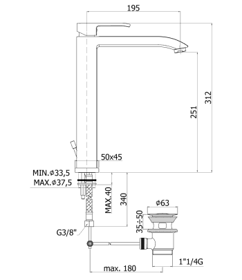 Miscelatore lavabo con piletta regolabile con tappo a scatto, flex inox di alimentazione, bocca 195 mm