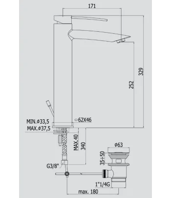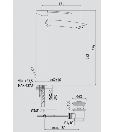 Rubinetto alto monocomando per lavandini d'appoggio con scarico up & down; flex inox cm 37 att. 1/2” F.