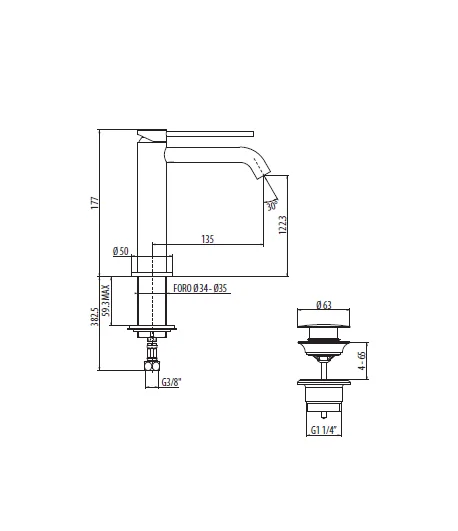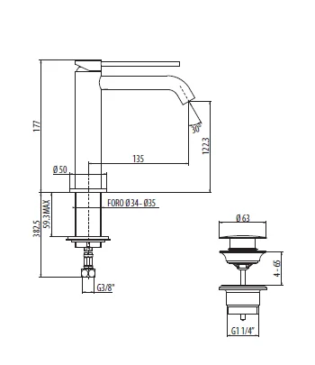 Miscelatore lavabo con piletta regolabile con tappo a scatto, flex inox di alimentazione, bocca 135 mm