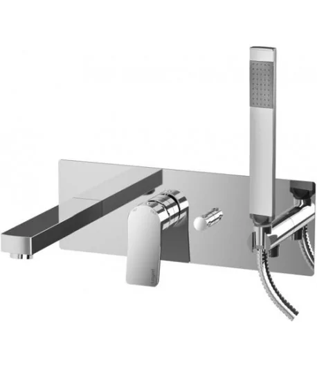 Rubinetto monocomando per vasca incasso, con deviatore, piastra orizzontale, con flessibile, doccetta e gancio di supporto.