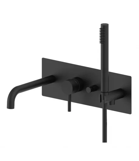 Rubinetto monocomando per vasca incasso, con deviatore, piastra orizzontale, con flessibile, doccetta e gancio di supporto.